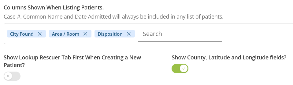 - Show County, Latitude, and Longitude Fields: When activated, you will see these fields when admitting or updating your patient records. If not activated, WRMD will automatically, in the background, geocode the address found location to gather that data.