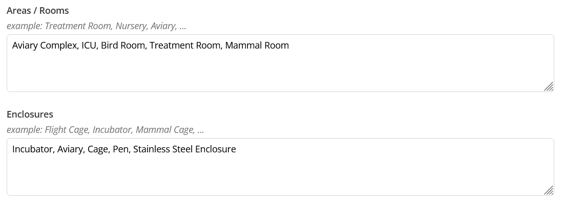 - Provide names of all the areas, rooms, and enclosures where you house your patients.