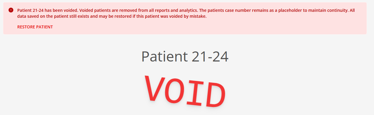 What if you realize that one of your patients who is in the middle of your case number sequence is a mistake and you want to delete it? Instead of deleting that record, you can remove that patient from your data/statistics/analytics by voiding them. Once voided, that patient will no longer be counted in any of your reporting or analytics. The record still exists; it has just been removed as a data point in your patient records. This means that if you, anyone in your organization, or even the authorities want to know what that case number was, there will be no suspicious-looking gap in the number sequence.
