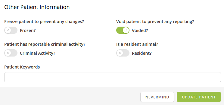 A popup screen will appear with a series of questions. Under "void patient to prevent any reporting", move the slider to Voided. This will prevent any further reporting on that specific patient record.