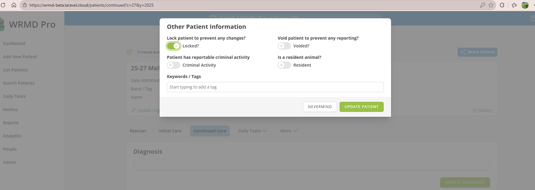 A patient can be unlocked by users who have permission to do so by repeating the above steps by moving the slider to its original position and updating the patient.