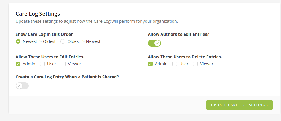 In this tutorial you will learn how to manage the settings of the Care Log. The Care Log Settings allows the administrator to establish parameters for the patient record where you input medical details about your patients. You can determine how to display the treatment records and who has permission to edit and delete records.
