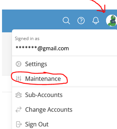 To access your account settings, click on your avatar in the upper right corner and choose Maintenance from the drop-down menu.