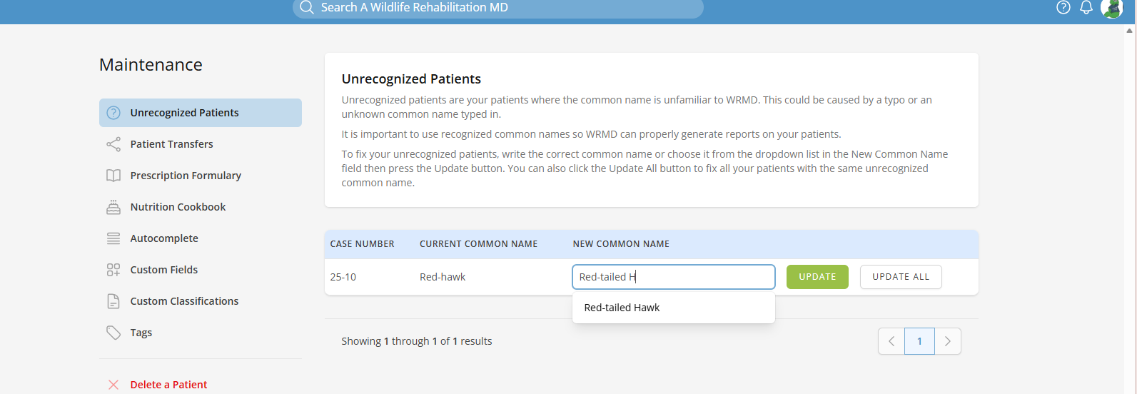 WRMD auto-suggests the common names of all the known species in the world. When you admit a patient, it is best to choose from this list. However, there are times when you acquire a patient, and you are not entirely sure what species it is. Instead of choosing from WRMD’s suggestions, you can type a general name until you determine the specific species. For example, if you cannot identify a baby bird, you might say “unidentified bird” or “small swallow”. You can include any name that will help you verify or recognize your patient until you can formally identify it and update WRMD with this information.