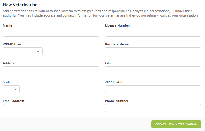 After completing the appropriate fields, click the Create New Veterinarian button.