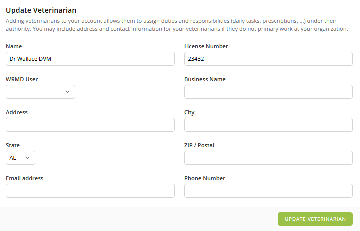 Click on the name of the veterinarian you wish to update to access their information. Change or modify any relevant information and click the Update Veterinarian button.