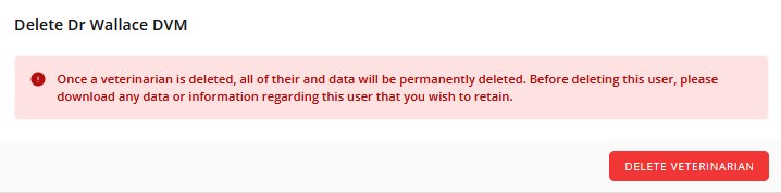 If your veterinarian is no longer affiliated with your organization and you want to remove them, you can accomplish this on the same page. It's important to note that deleting a veterinarian will result in the removal of all associated data. Therefore, before deletion, ensure that you download any data or information related to this user that you intend to keep.