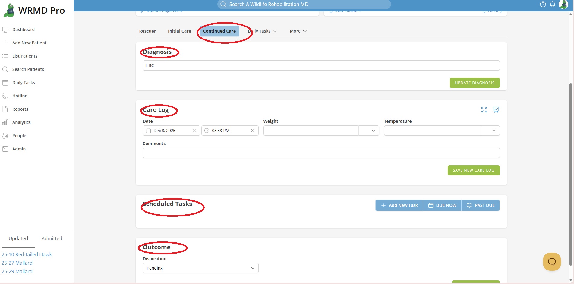 - This section appears on both the Continued Care Tab and the Initial Care tab for easy reference. Information in this field relates to the animal’s disposition.