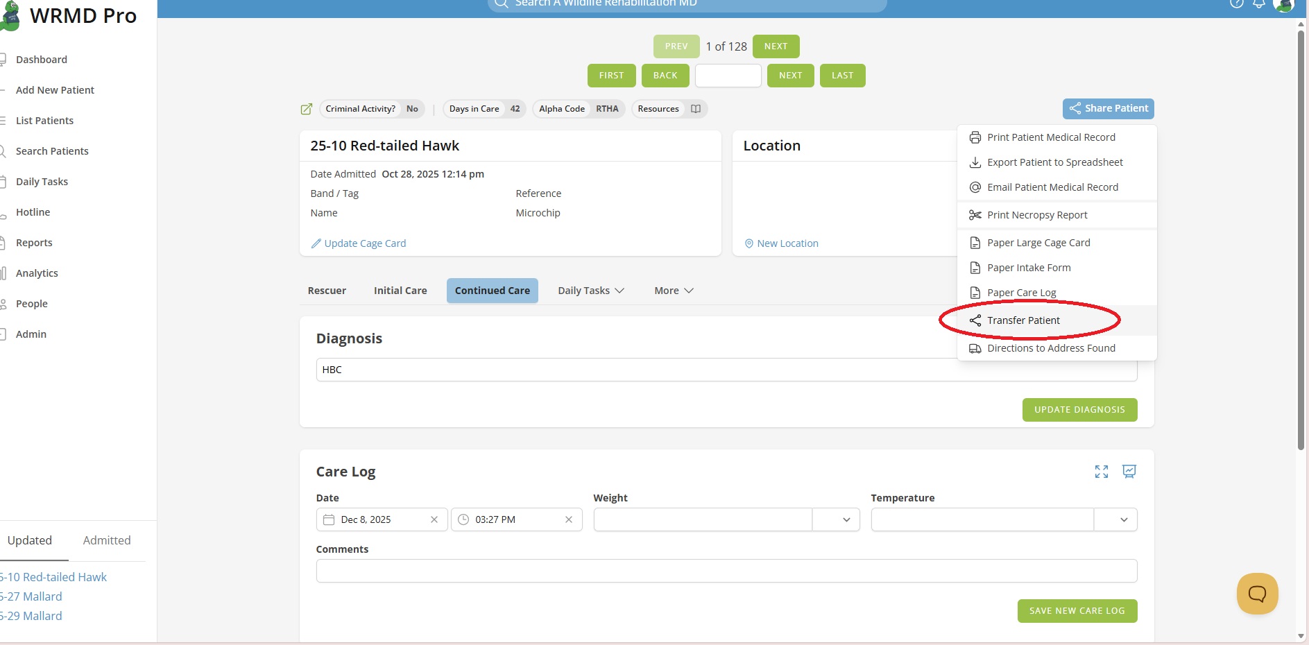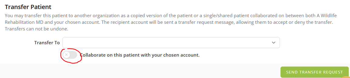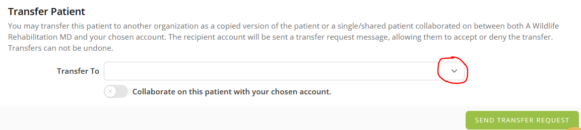 There are several reasons for transferring an animal to another center. One reason is that you received an animal that you are unable to care for or do not have the proper facility for its care. In this case, you would need to transfer it to a center that is more capable of handling and/or caring for that animal. For instance, if you are set up to care for mammals, but received an injured water bird, you would need to transfer that animal to another center. Another reason to transfer an animal might be because your patient needs specialized care such as surgery or flight time in a large aviary and will be returning to your center for further monitoring. Either way, WRMD allows you to easily transfer information on a patient between facilities.