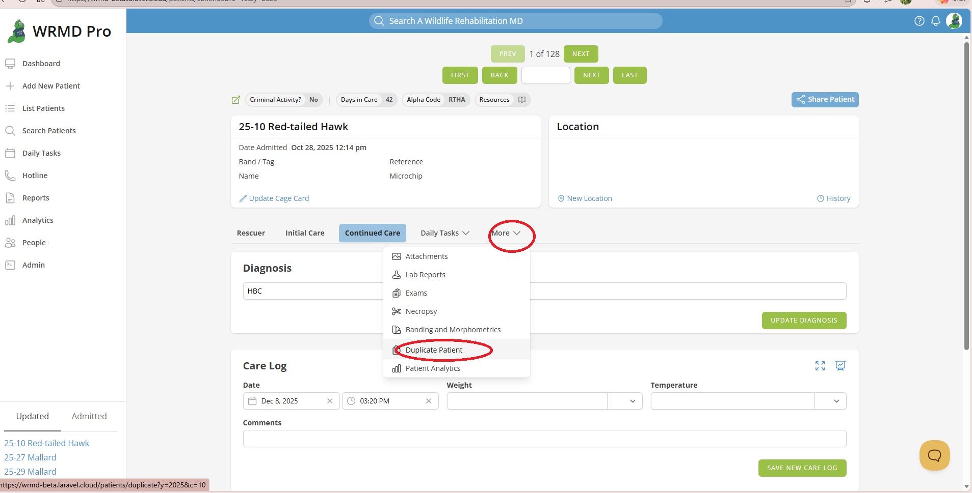 You may want to duplicate a record if the patient you have received is similar to an existing record. For example, you may encounter a situation where the same rescuer finds the sibling of an animal they brought in previously. Since the rescuer information and location details are the same, it will save you time if you simply duplicate the existing record.