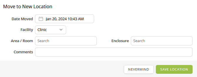- This describes a specific enclosure within the designated area/room (i.e.: ICU 5, Aviary 1, etc.). Fill out the text field with the names of your specific areas. WRMD remembers these for later reference and includes them in a dropdown list.