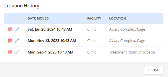 A new screen will pop up, allowing you to see all previous locations of the animal. If you have allowable permissions, you may also be able to edit or delete these locations from the list, as indicated by the blue editing pen or the red trash bin icons.