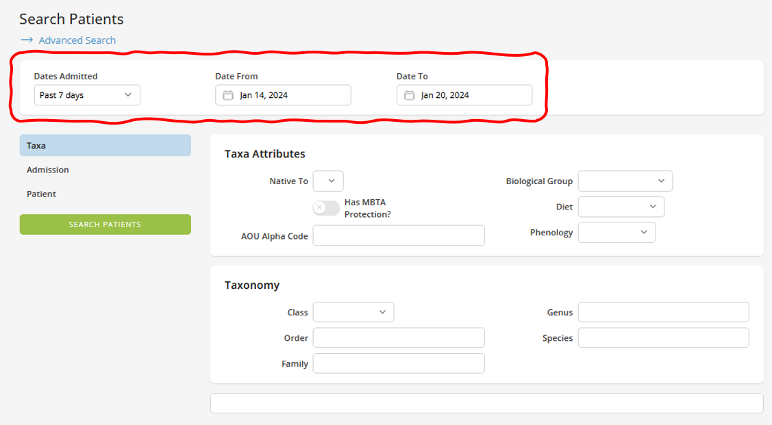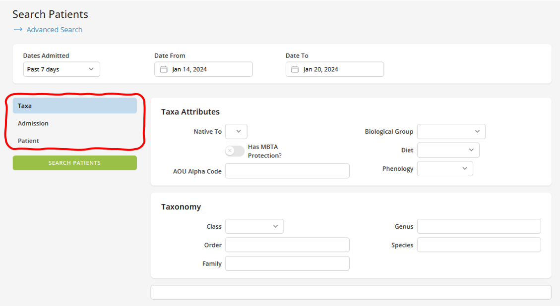 WRMD allows you to search by Taxa Attributes, Admission Information, and Patient Details. Click through the tabs and fill in whatever field that is relevant to your search.