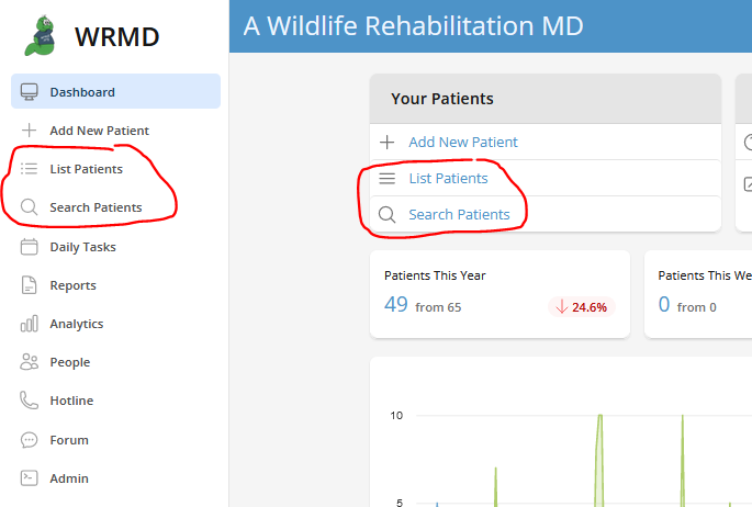 Access your patient's record by either conducting a patient search or utilizing the list patient feature on the dashboard. These features are available in two different sections on the dashboard.
