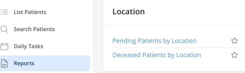 You will see two reports in this category, Pending Patients by Location and Deceased Patients by Location. Both are run the same way. The example below shows Pending Patients by Location.