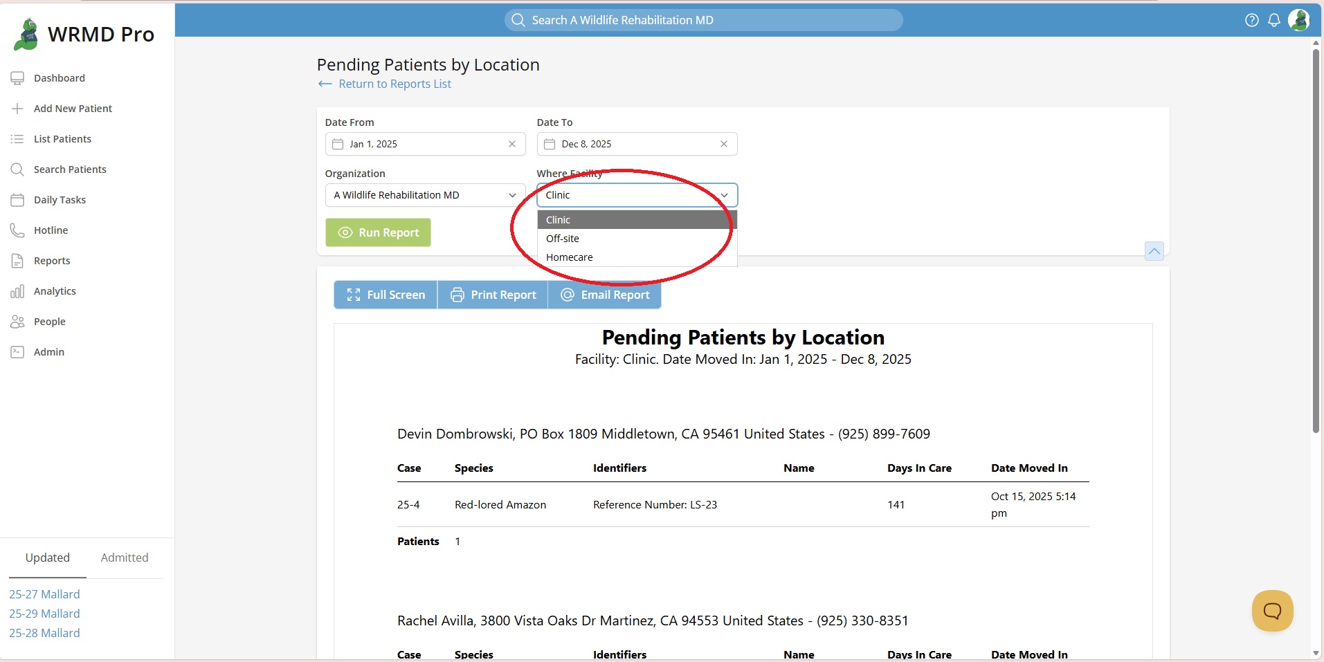 You can filter the report’s data by date (choose Custom to specify calendar dates) and holding location (clinic, off-site, homecare). You can even designate a specific location area. Click the green Run Report button. Reports can be printed or emailed.