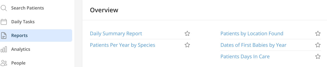 To access the Report section, click on Reports from the Quick Links toolbar. Under the Standard tab, you can find the category Overview Reports. You will see the following reports in this category.