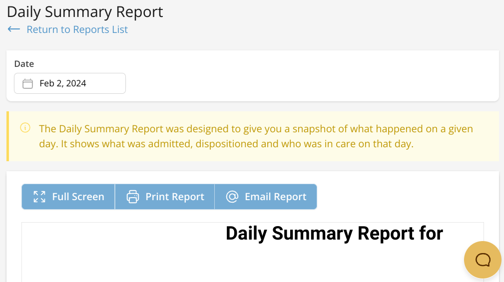 The Daily Summary Report was designed to give you a snapshot of what happened on a given day. It shows what was admitted, dispositioned, and who was in care on that day.