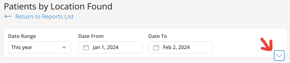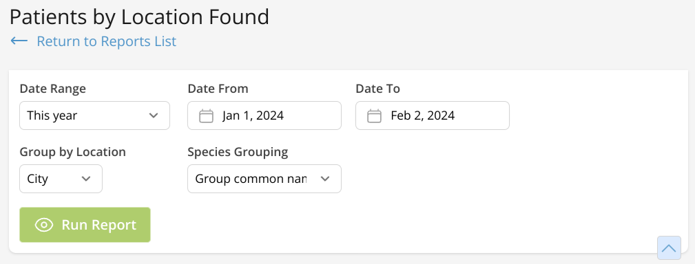 The Patients by Location Found report gives you two filters to view the total number of species that came into care by the city, county, or state they were found. Exporting options are print or email. Use the arrow on the right side to expand the filter options.