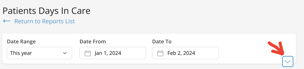 This report provides the number of days each patient was in care for all patients admitted during the chosen date range. Use the arrow on the right to expand the filter options.