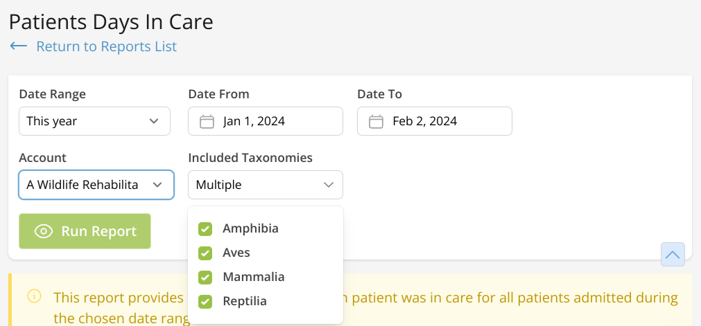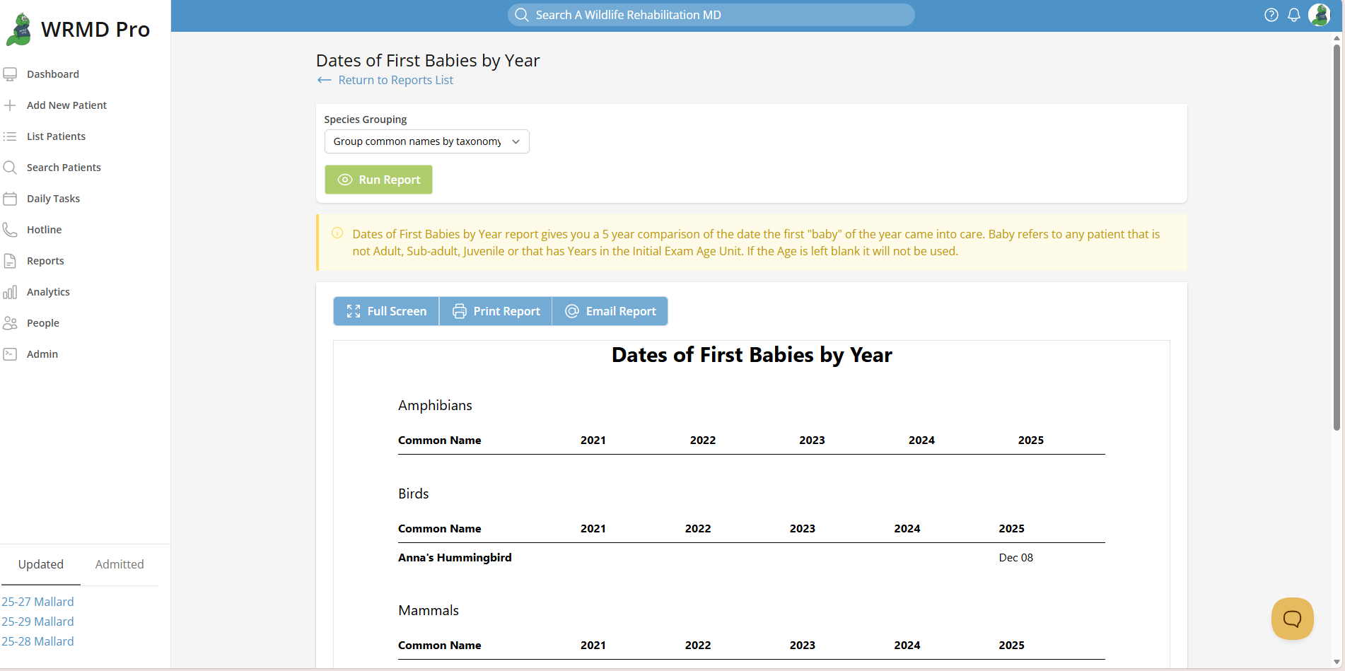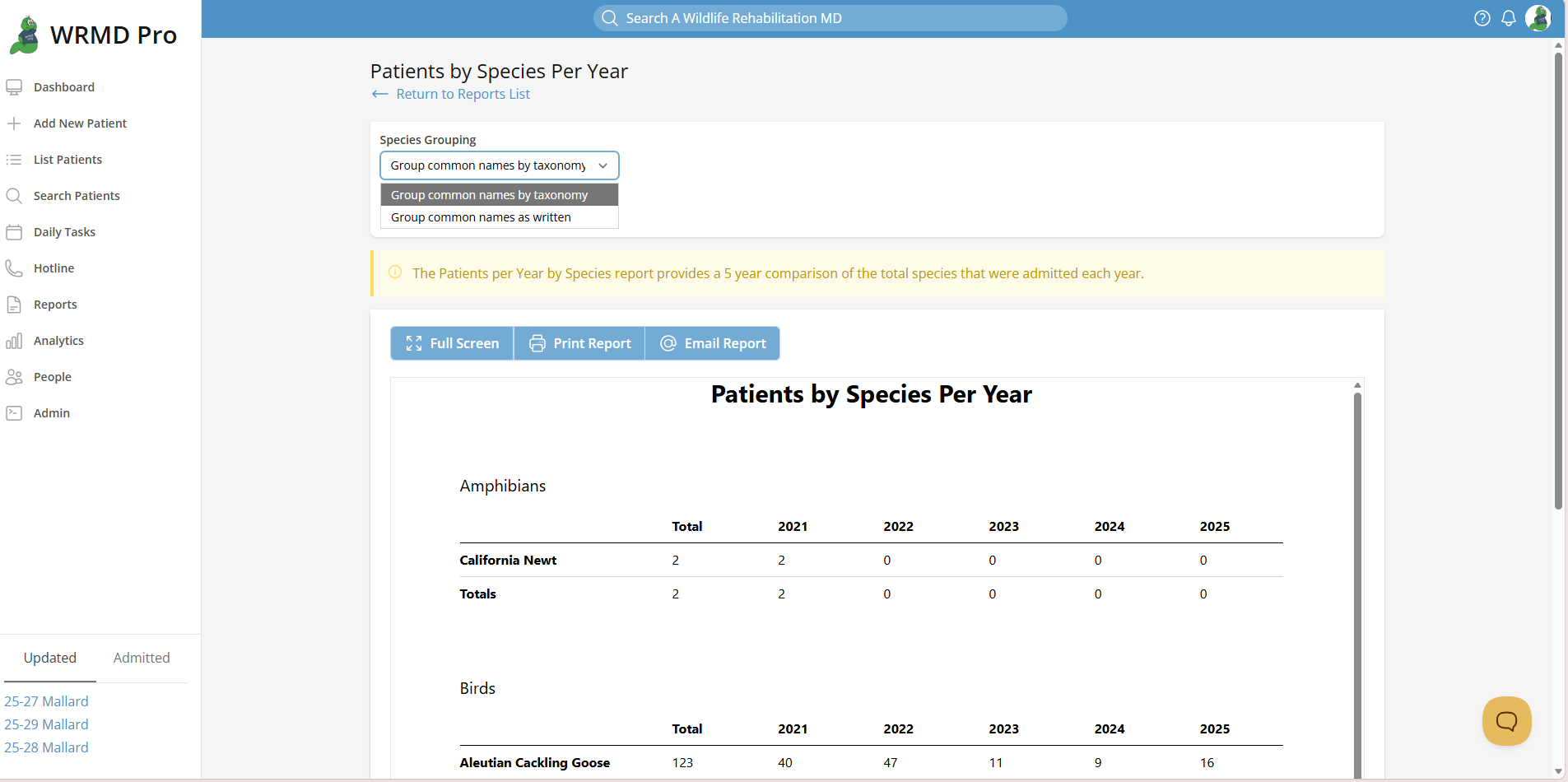 The Patients by species per year report gives you a five-year comparison of the total species that came into care for a given year. You can filter this report by taxonomy. Exporting options are print or email.
