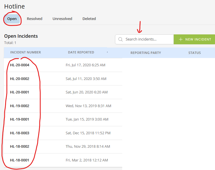 If your incident is currently active, you'll find it listed on the Hotline Index Page under the Open Tab. Once your incident is resolved, it will move to the Resolved Tab. If your incident remains unresolved, you can locate it on the Hotline Index Page under the Unresolved Tab. If the incident has been deleted, it will appear under the Deleted Tab.