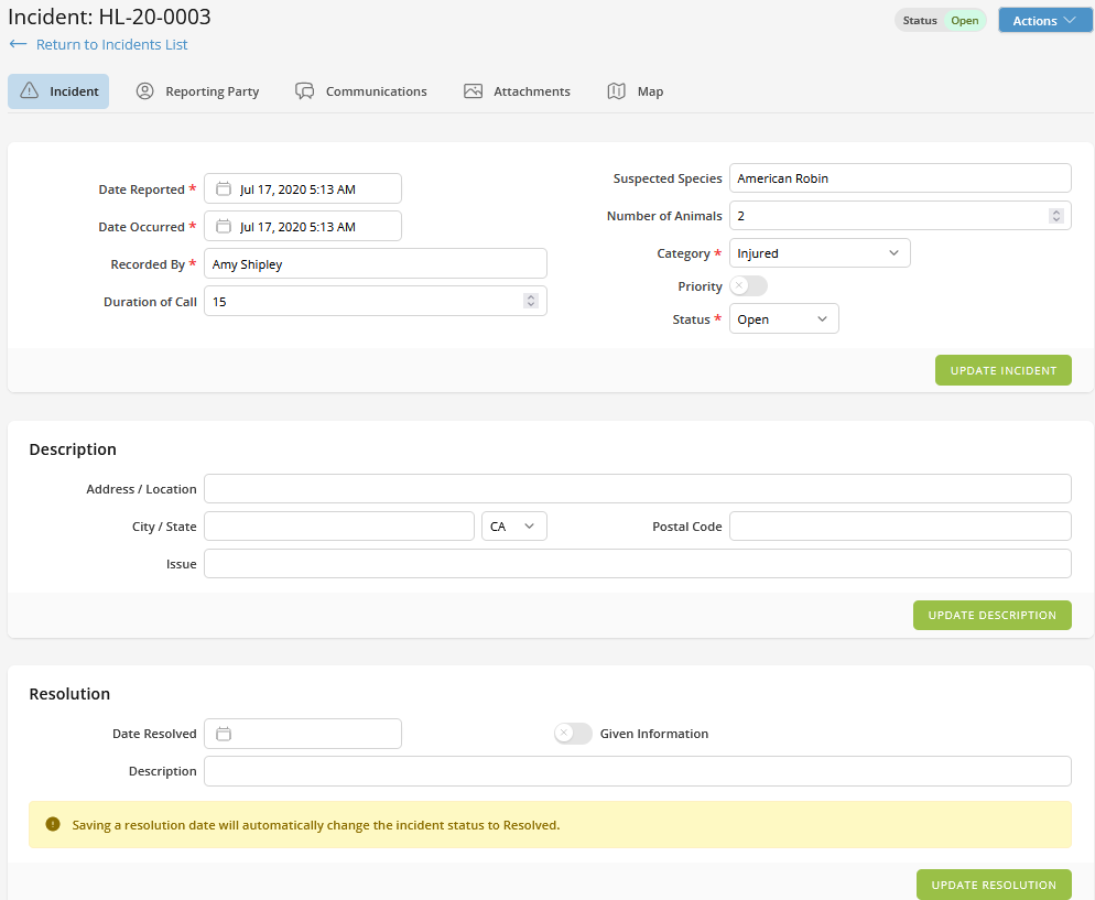 On the incident page, you can update or clarify information, continue the communications about the incident, or resolve the incident. Click on the relevant tab to access the fields you need.