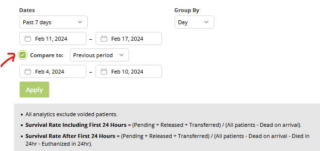 If you wish to compare the analytics to a previous time period, click the Compare to checkbox and choose the appropriate time period from the dropdown menu.