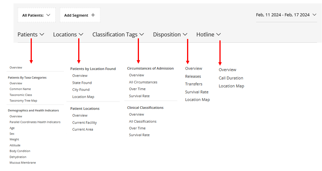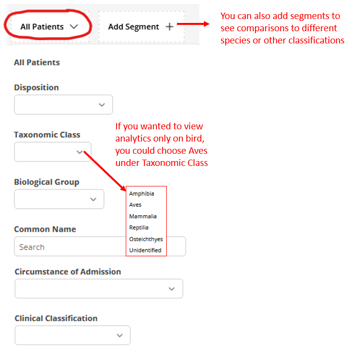 To apply filters, click the All Patients dropdown menu. From there, select the segments you wish to view. For example, if you're interested in viewing only bird data, choose 'Aves' under Taxonomic Class. This action will recalibrate your analytics, displaying information solely for Aves.