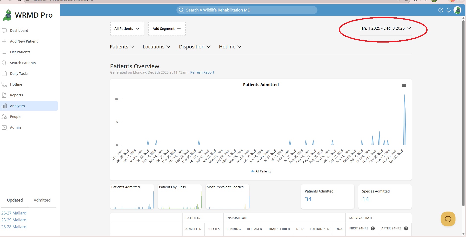 By default, WRMD's analytics display data for all admitted patients at your center, excluding voided cases. However, you have the flexibility to specify particular groups of species. For instance, you can narrow down analytics to focus solely on bird patients, animals from a specific town, those caught by a cat, or any other criteria you prefer. You can even add more segments to facilitate comparisons between species.
