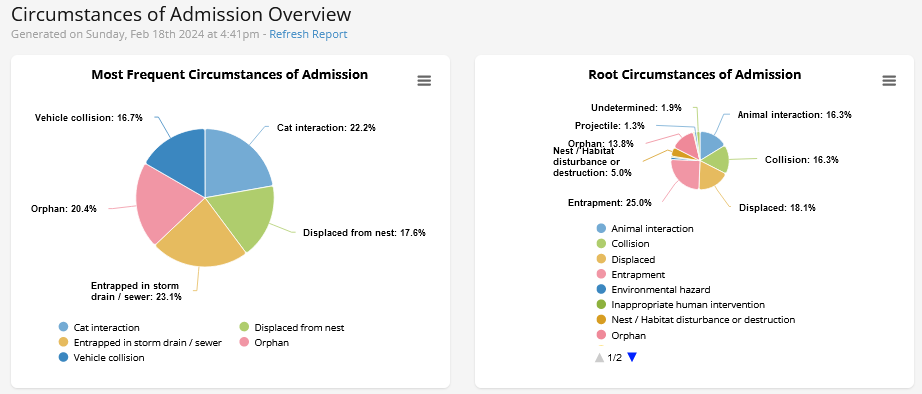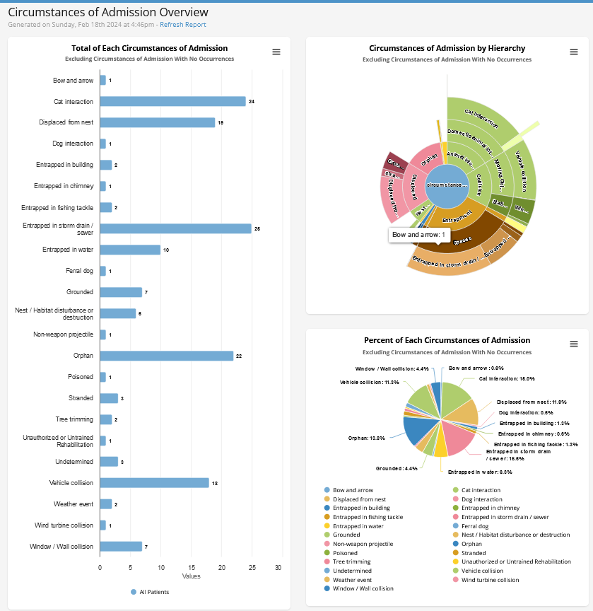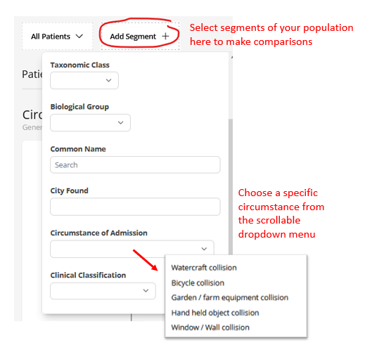 Select Circumstances is a great way to compare circumstances of admission against multiple segments of your patients. By selecting Add Segment and choosing the type of circumstance from the dropdown menu, you can gain a great deal of information about the types of incidents that occur with certain species and how different species compare during your designated time frame.