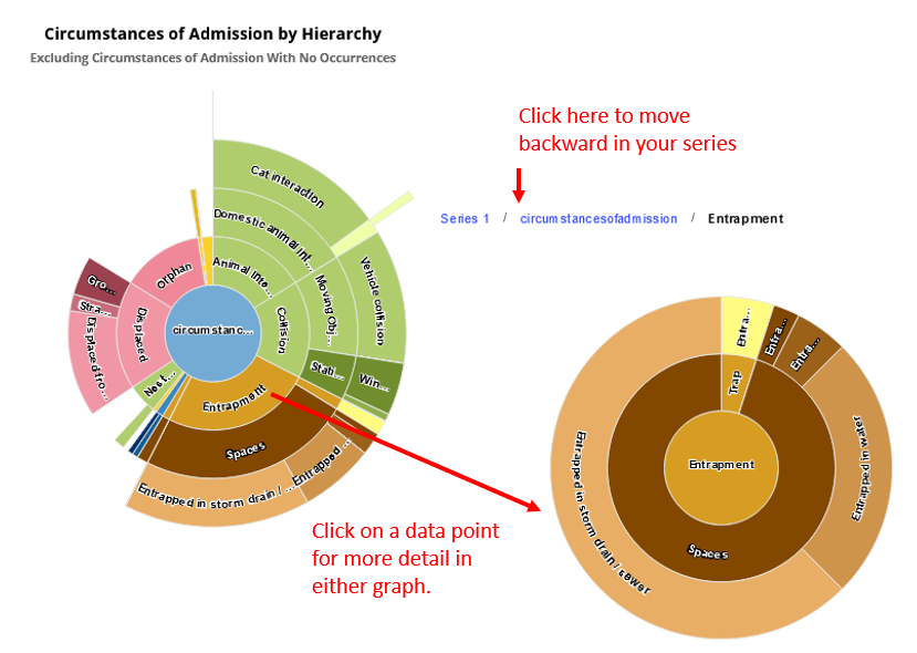 You can click data points on the Circumstance of Admission by Hierarchy chart for more details. To return to the main chart, click the back button.