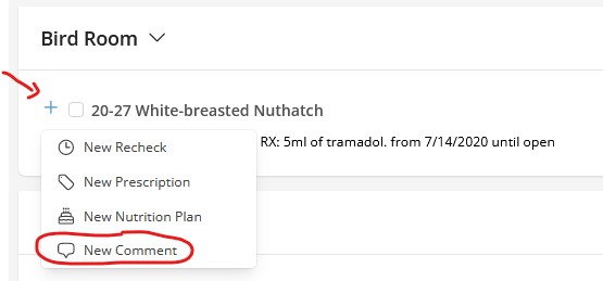 Click the Plus Sign (+) next to the patient's name and click New Care Log Comment from the drop down menu.