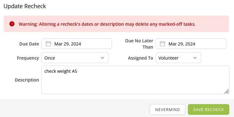 You will receive a warning, indicating that altering an action or description may delete any marked-off tasks. If you still wish to continue, make your changes and click the Save Button.