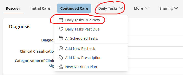 Click on the Daily Tasks tab in the patient's record to access the drop-down menu and choose Daily Tasks Due Now.
