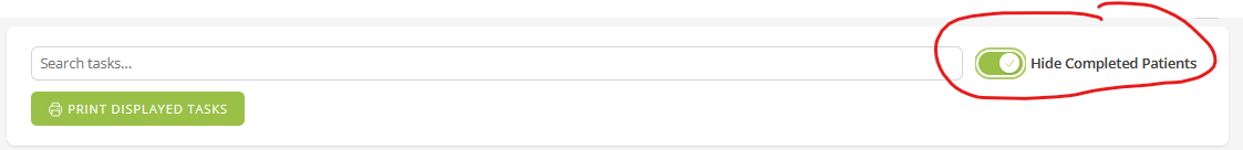 You can click the Hide Completed Patients toggle switch as you work through your daily tasks and mark patients as complete. This action removes from view the patients you've finished working on. This feature helps you stay focused on the patients who still need your attention.