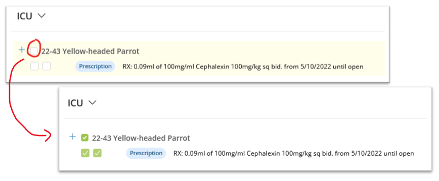 Clicking the box one time next to any task will display a checkmark for that action indicating that it is complete. Marking the box next to the patient's name will automatically mark all actions related to that patient with a checkmark indicating all tasks associated with that patient have been completed.