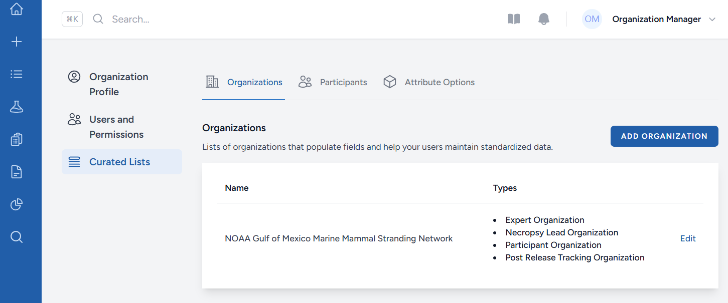 From here, there are three tabs with different curated lists: Organizations, Participants, and Attribute Options. Click on the tab for the list you would like to edit. Instructions for each tab follow below. These curated lists standardize your data, reduce spelling errors, and customize picklists to your organization.