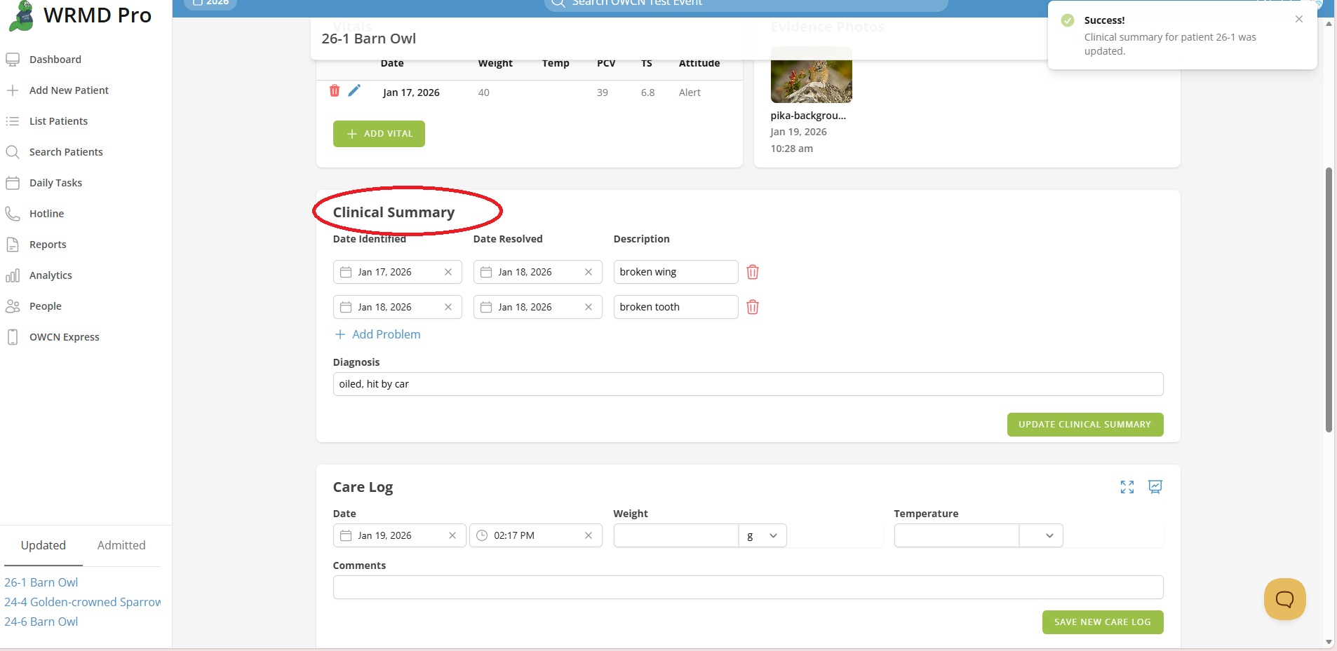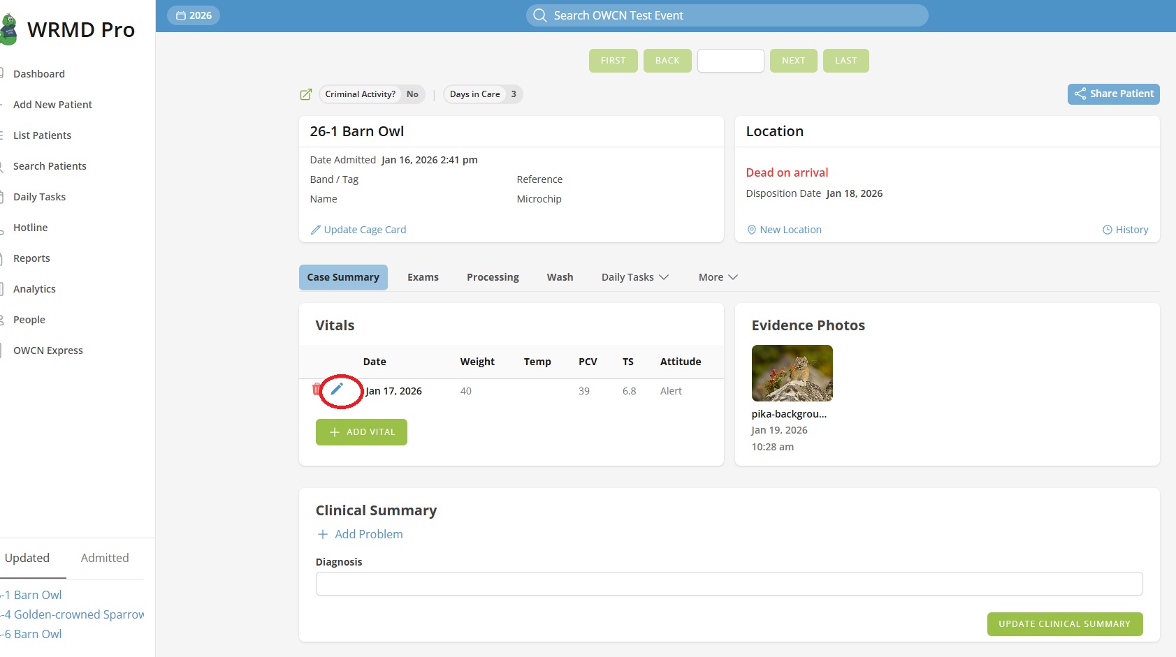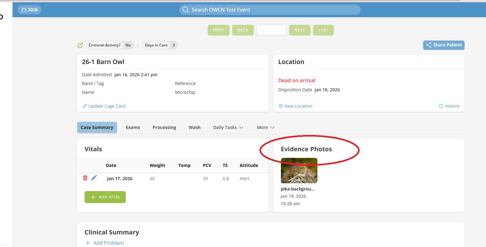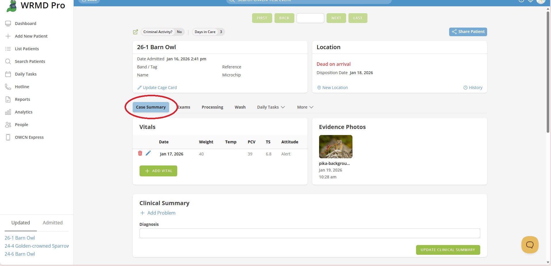 This tutorial explains how to use the Case Summary page for oiled wildlife patients. The Case Summary provides an at-a-glance overview of the patient's vitals, evidence photos, clinical status, care logs, and daily tasks.