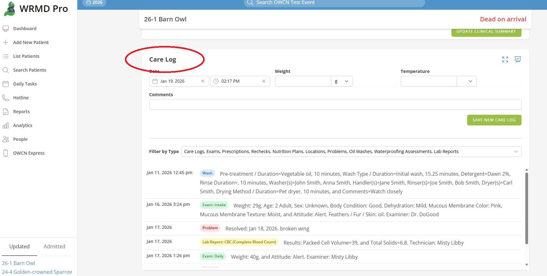 The Care Log section tracks ongoing care activities and observations for the patient.