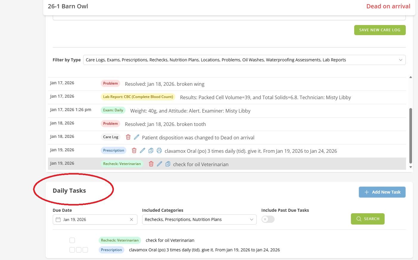 The Daily Tasks section helps manage scheduled tasks and treatments for the patient.